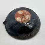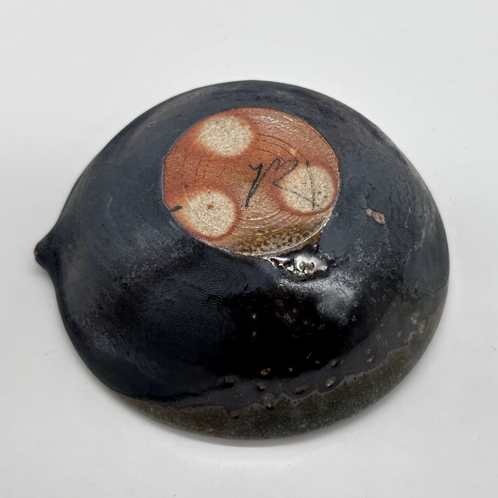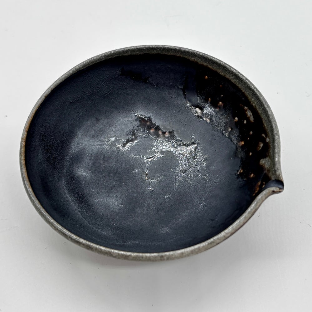 This Ramekin is made from a porcelain/stoneware blend and coated with a dark clay body slip. It was fired in a gas kiln and soda was added.