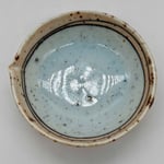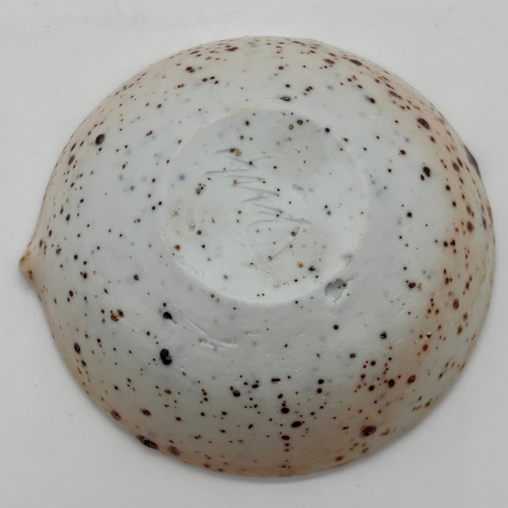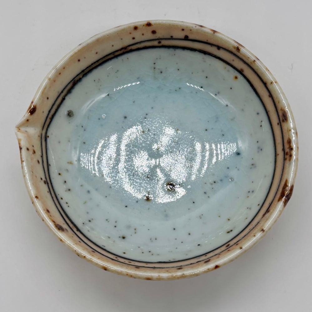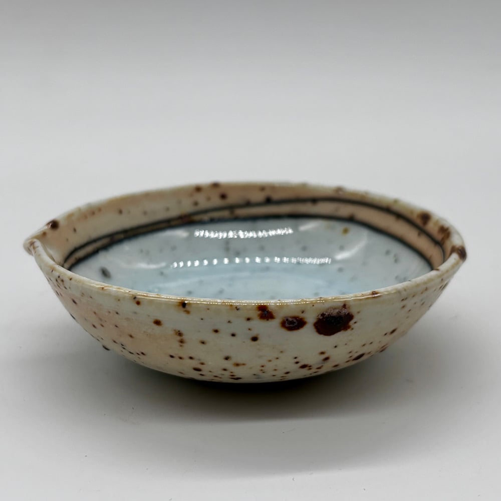 This Ramekin is made out of porcelain blended with playground sand. It was inlayed with a black stain and has a durable celadon liner glaze. It was fired in a gas kiln and soda was added.