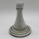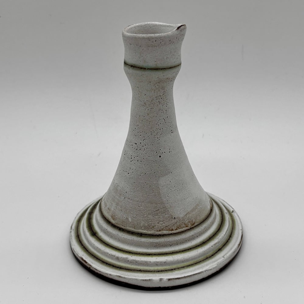 This candle stick holder is made out of a dark stoneware, inlayed with copper carbonate and glazed with a matte white glaze.