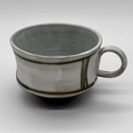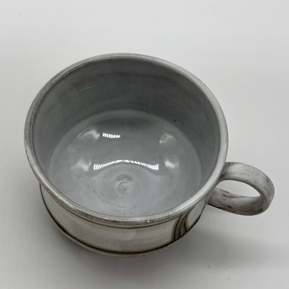 This 6oz Espresso cup is made out of a dark stoneware. It is inlayed with copper carbonate and glazed with a durable white glaze on the inside and a matte white glaze on the outside.