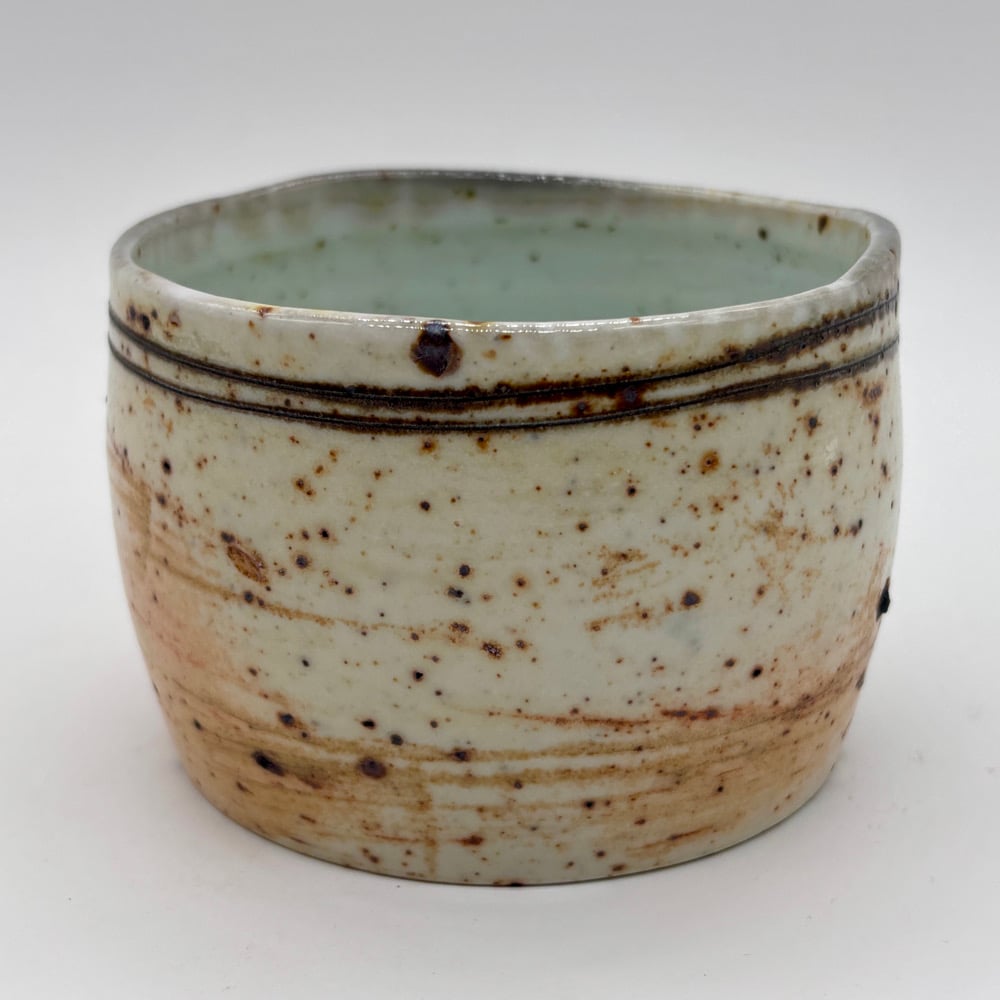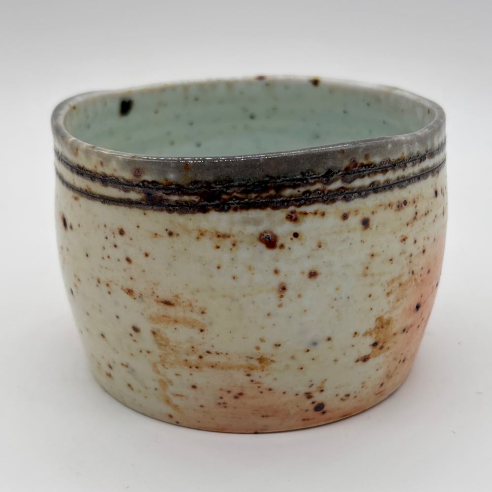 This 12oz rocks cup is made out of porcelain blended with playground sand. It was inlayed with a black stain and has a durable celadon liner glaze. It was fired in a gas kiln and soda was added.