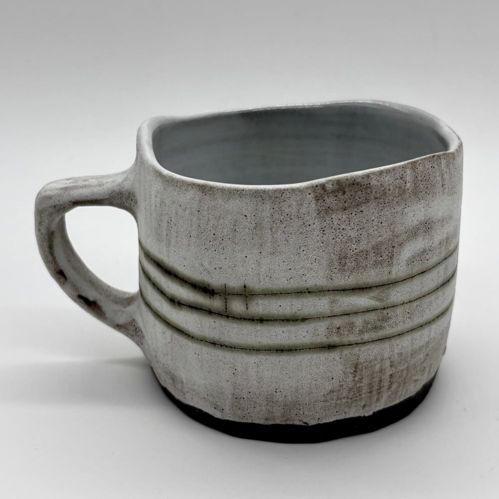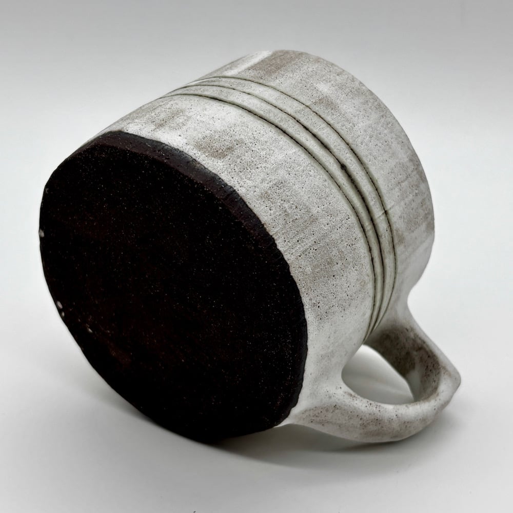 This 12oz mug is made out of a dark stoneware, inlayed with copper carbonate and glazed with a matte white glaze on the outside. There is a durable white liner glaze on the inside.
