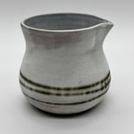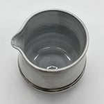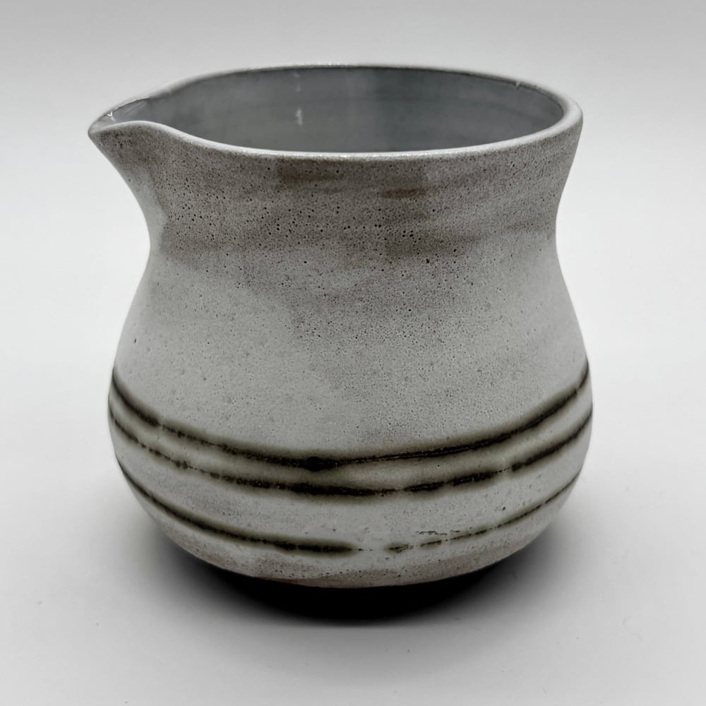 This 10oz pourer is made out of dark Stoneware. It has a durable white liner glaze. The exterior is glazed with a matte white glaze that has been inlayed with copper carbonate.
