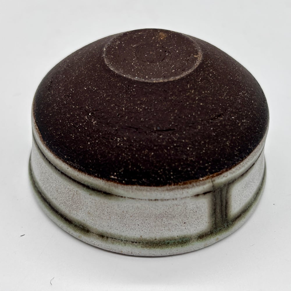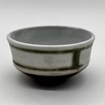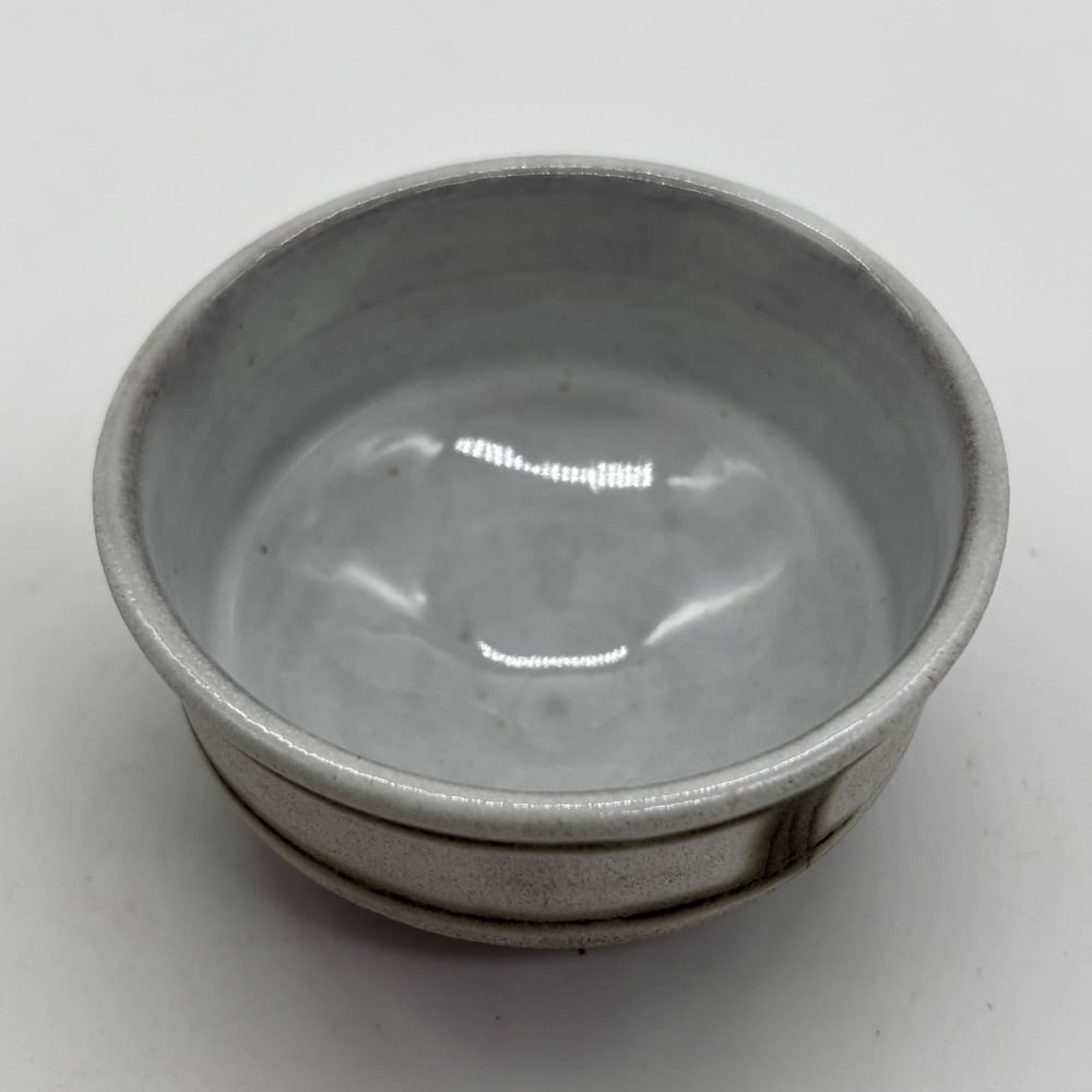 This 2oz cup is made of a dark stoneware clay body. It was inlayed with copper carbonate and glazed with a durable white glaze on the inside and a satin white glaze on the outside.