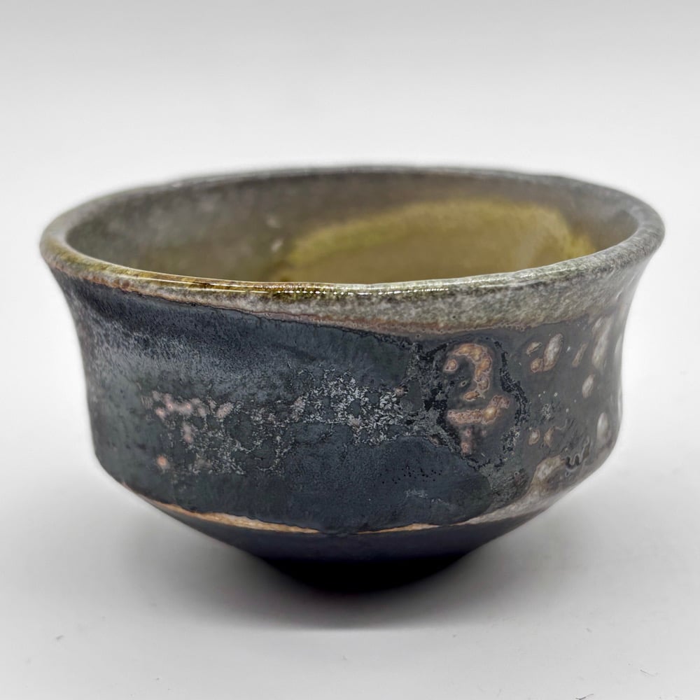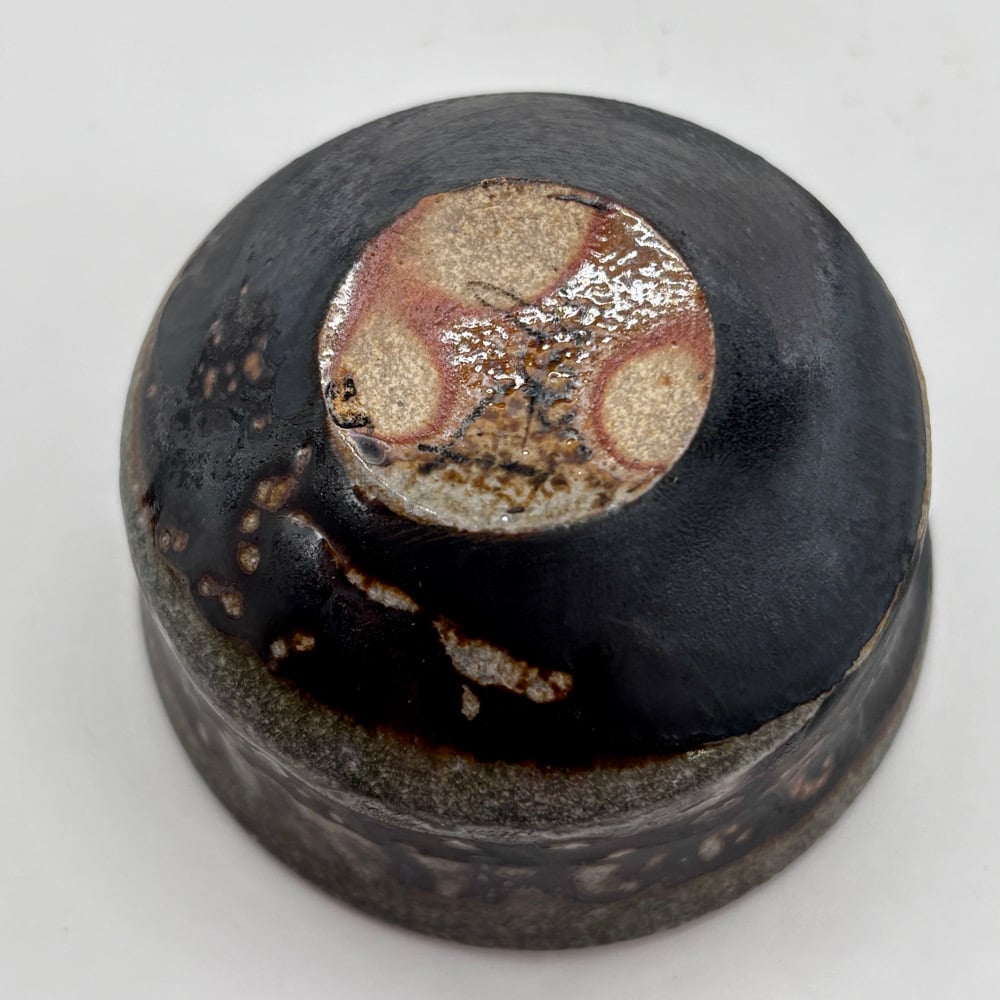 This 3oz cup is made from a porcelain/stoneware blend and coated with a dark clay body slip. It was fired in a gas kiln and soda was added.