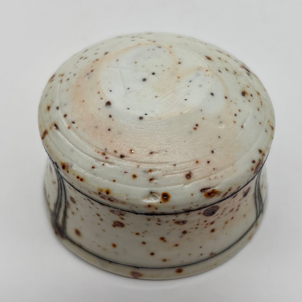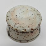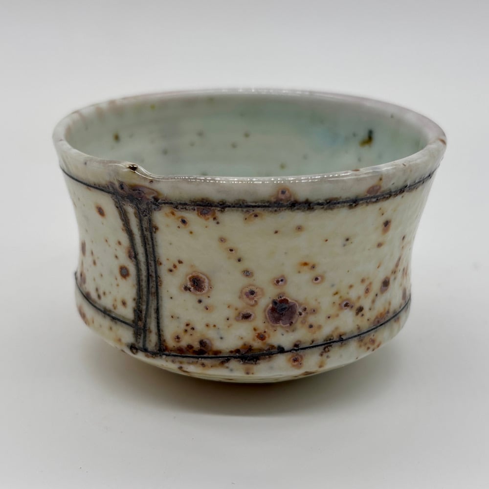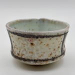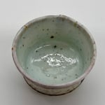 This 4oz Cup is made out of porcelain blended with playground sand. It was inlayed with a black stain and has durable celadon liner glaze. It was fired in a gas kiln and soda was added.